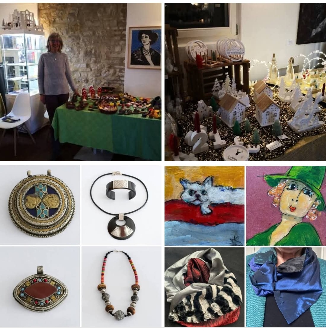 Regina Weiland zeigt einige schöne ältere Schmuckobjekte, feine Stoffe und kleine Glasobjekte. Abgerundet wird der kleine Weihnachtsmarkt mit feinen Schaals von Karla Gehrhard und Bildern von Architektin und Künstlerin Doris Zorn, beide aus Darmstadt, vorgestellt von Gabriele Busch.