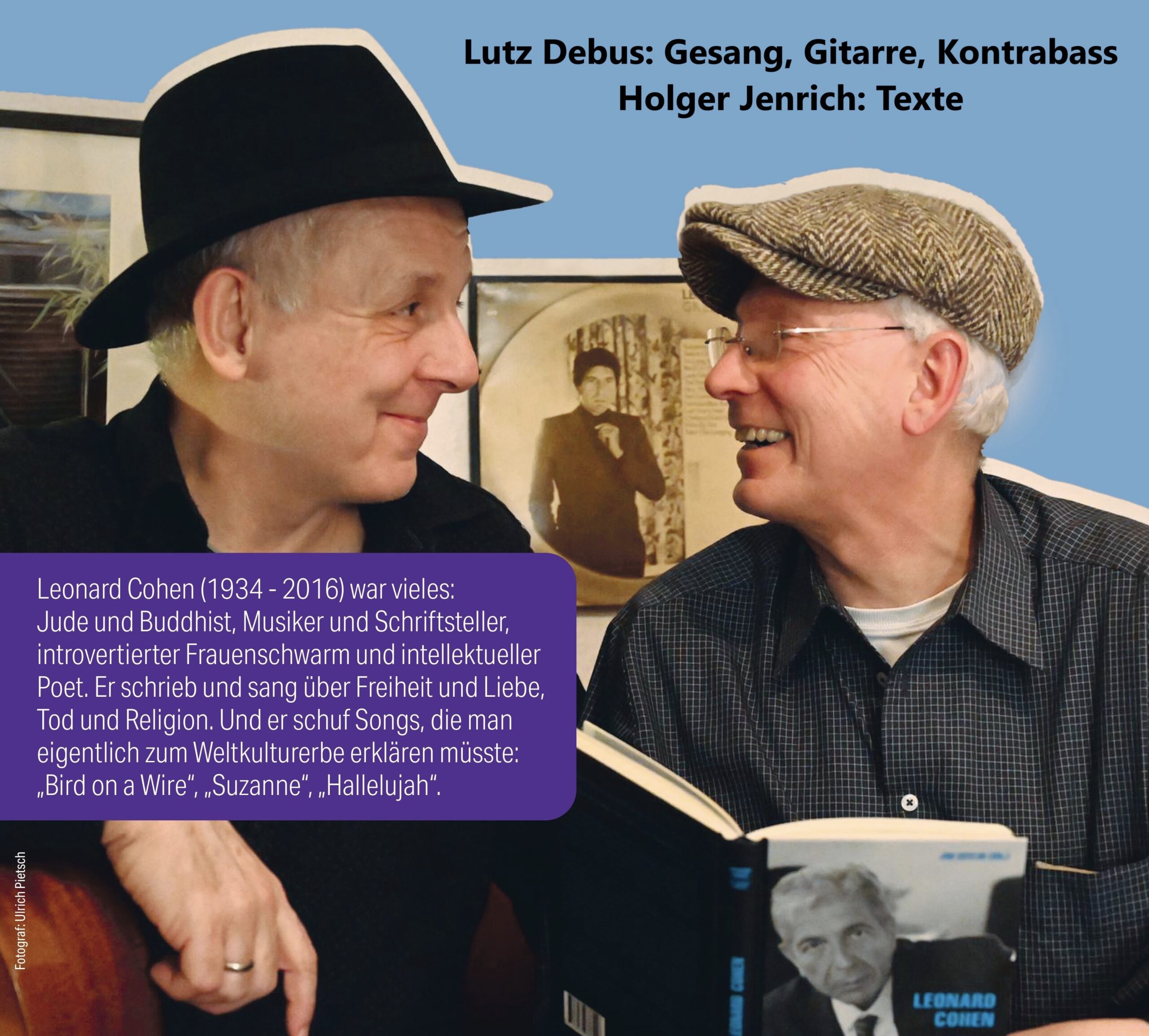 Die beiden Protagonisten Lutz Debus und Holger Jenrich präsentieren sehr authentisch den facetenreichen Künstler Leonard Cohen. Sie bewegen sich musizierend und erzählend durch sein Leben, sein Denken und sein Schaffen. Eine Hommage an Leonard Cohen mit Liedern, Texten und persönlichen Erinnerungen.