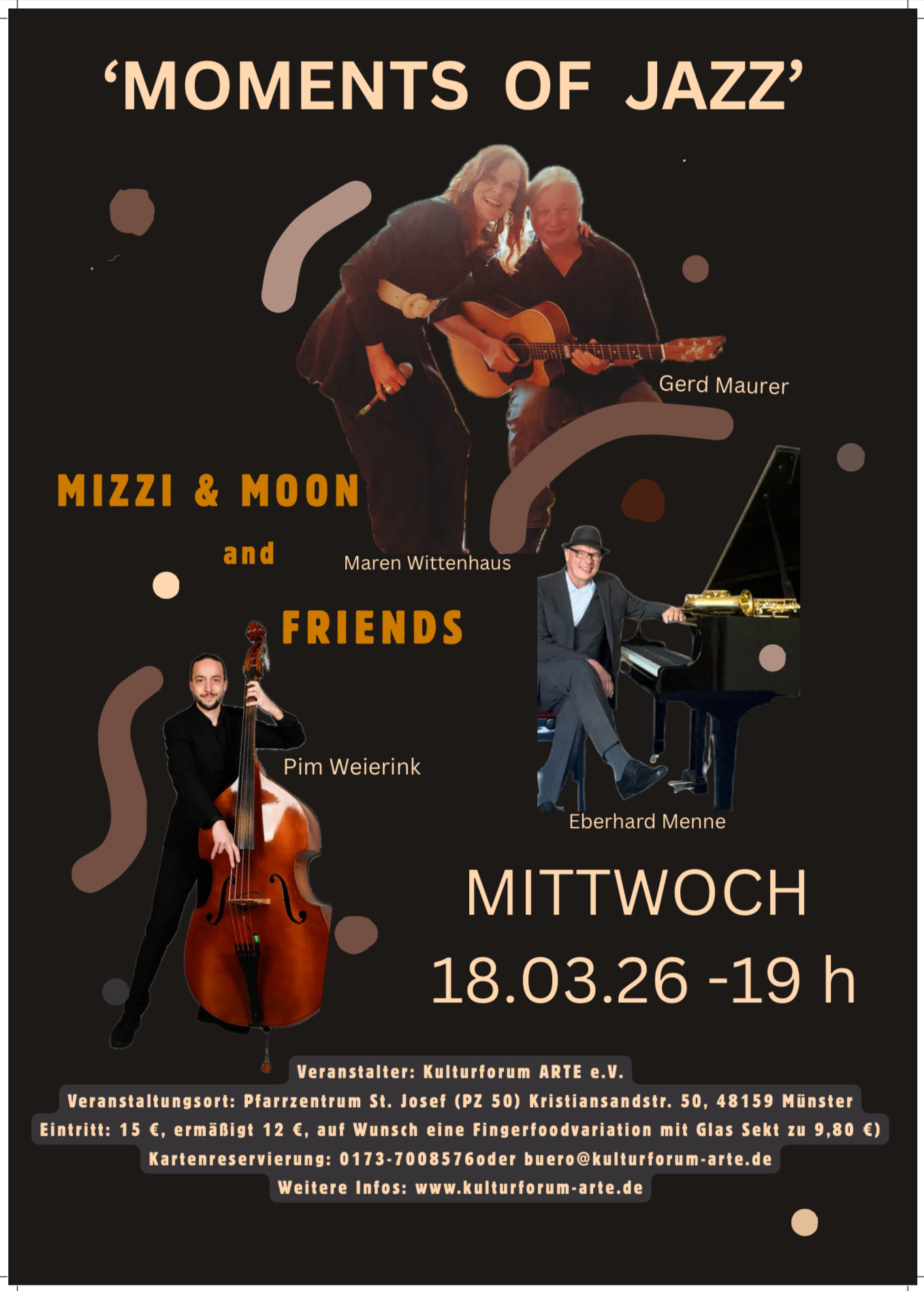 Mi. 18.03.26 um 19 h: „Moments of Jazz“ mit „Mizzi & Moon with Friends“ Maren Wittenhaus (Volal), Gerd Maurer (Gitarre), Eberhart Menne (Piano) & Pim Weierlink (Contrabass)