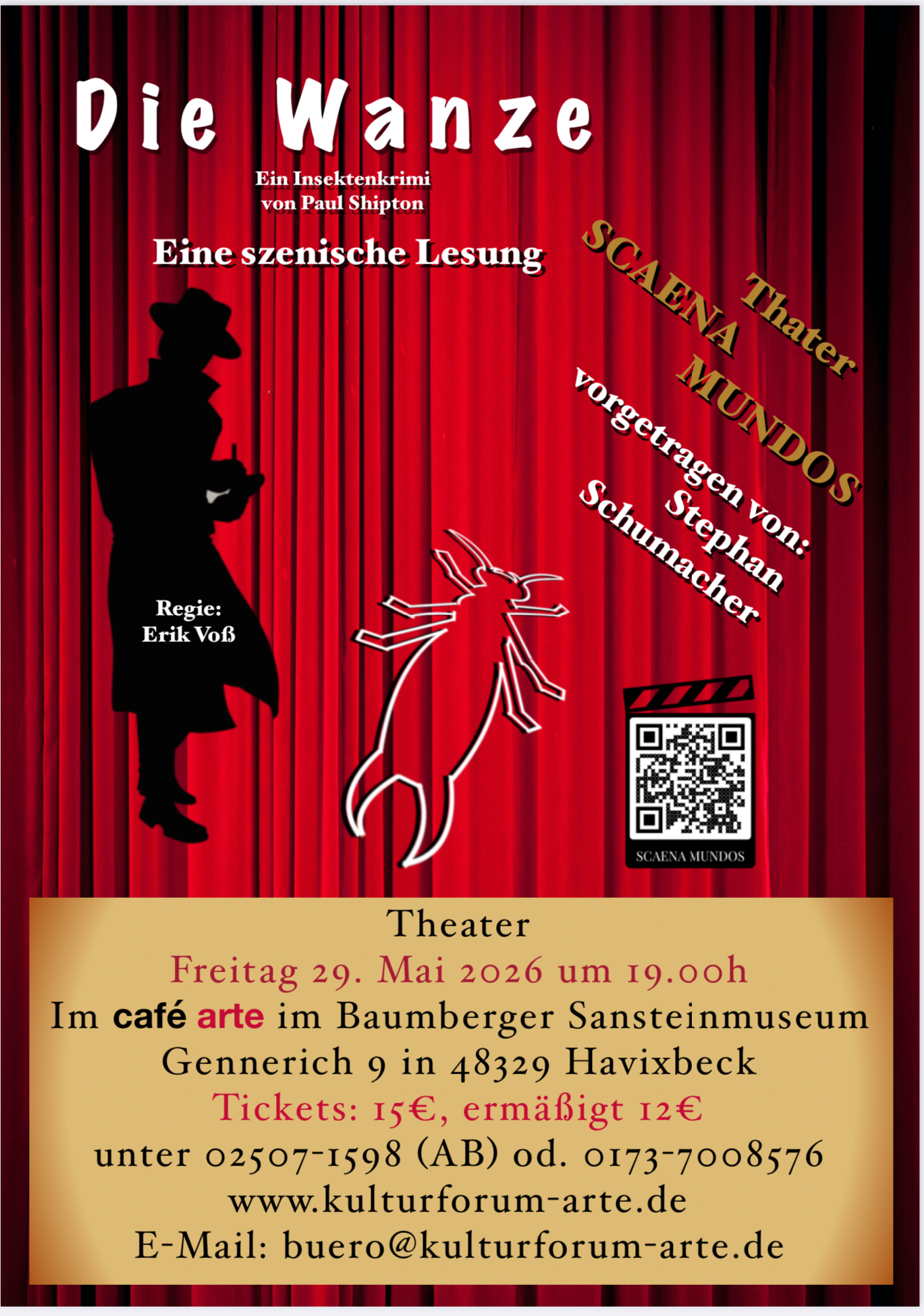 Für unsere VERANSTALTUNGEN bitten wir rechtzeitig die Karten vorzubestellen. Die Kartenvorbestellung ist möglich unter: buero@kulturforum-arte.de oder unter 02507-1598